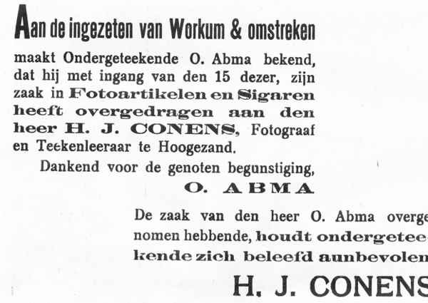 Oepke abma had een winkel aan 't Súd 50. 18 december 1937 meldt Oepke Abma dat hij de zaak heeft overgedaan aan H.J.Conens fotograaf en teekenleraar te Hoogezand. |