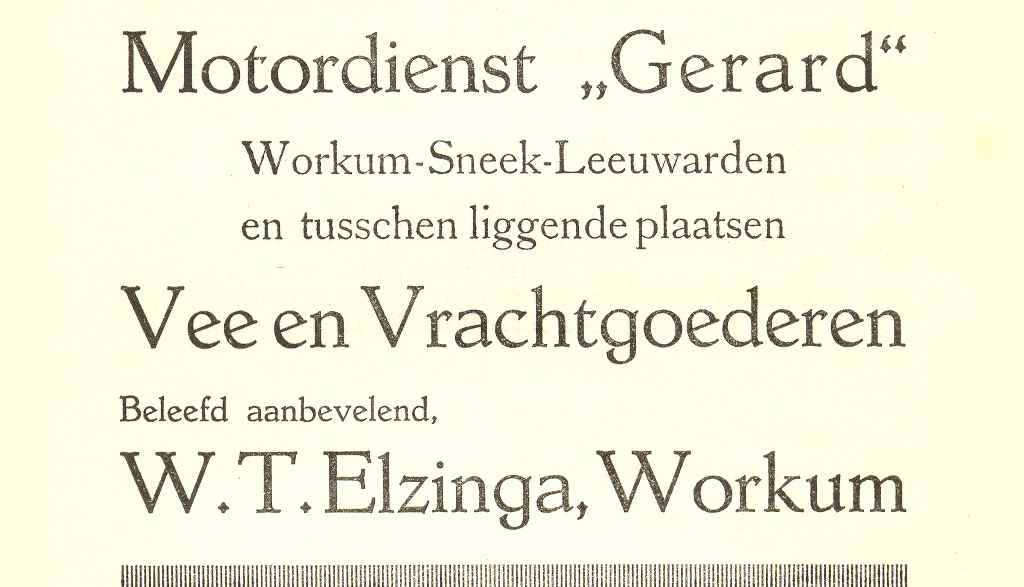| M.s. “Gerard”, waarmee Wijbe Elzinga vanaf 1930 tot in de oorlog de beurtdienst Workum – Sneek – Leeuwarden onderhield. De “Gerard” was genoemd naar een telg uit de familie Faber en een zusterschip van de “Johanna Jacoba” in IJlst en van de “Mintje”, waarmee hij tijdens de oorlog voer. Op de achtergrond zien we de spoorbrug met de toen nog bestaande Wachtpost. |